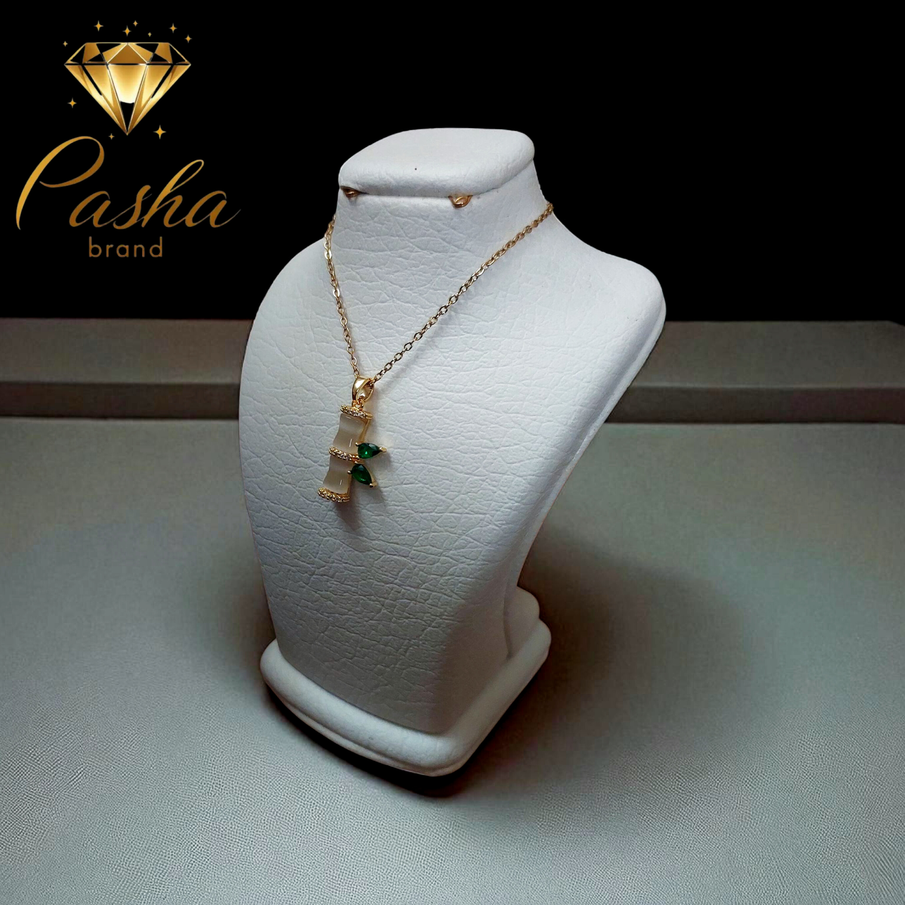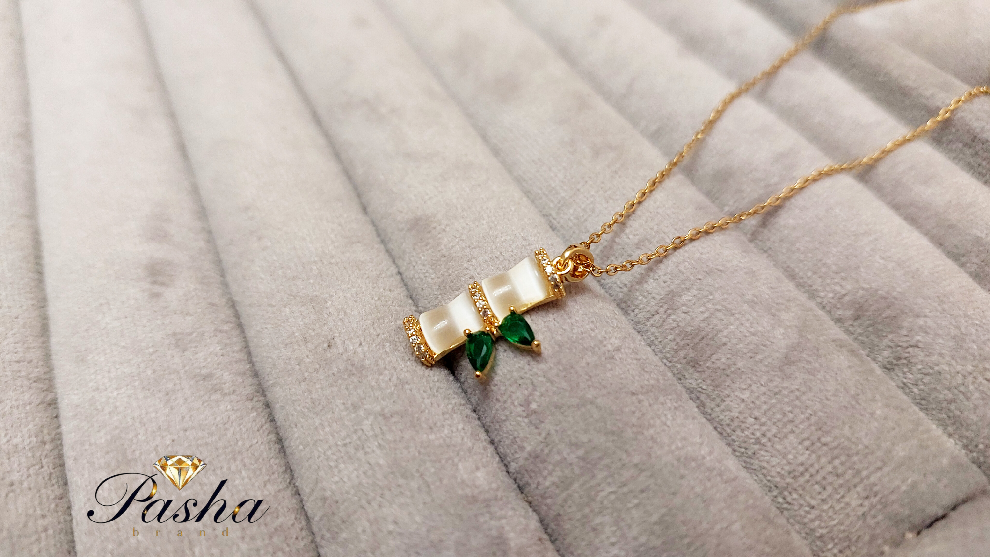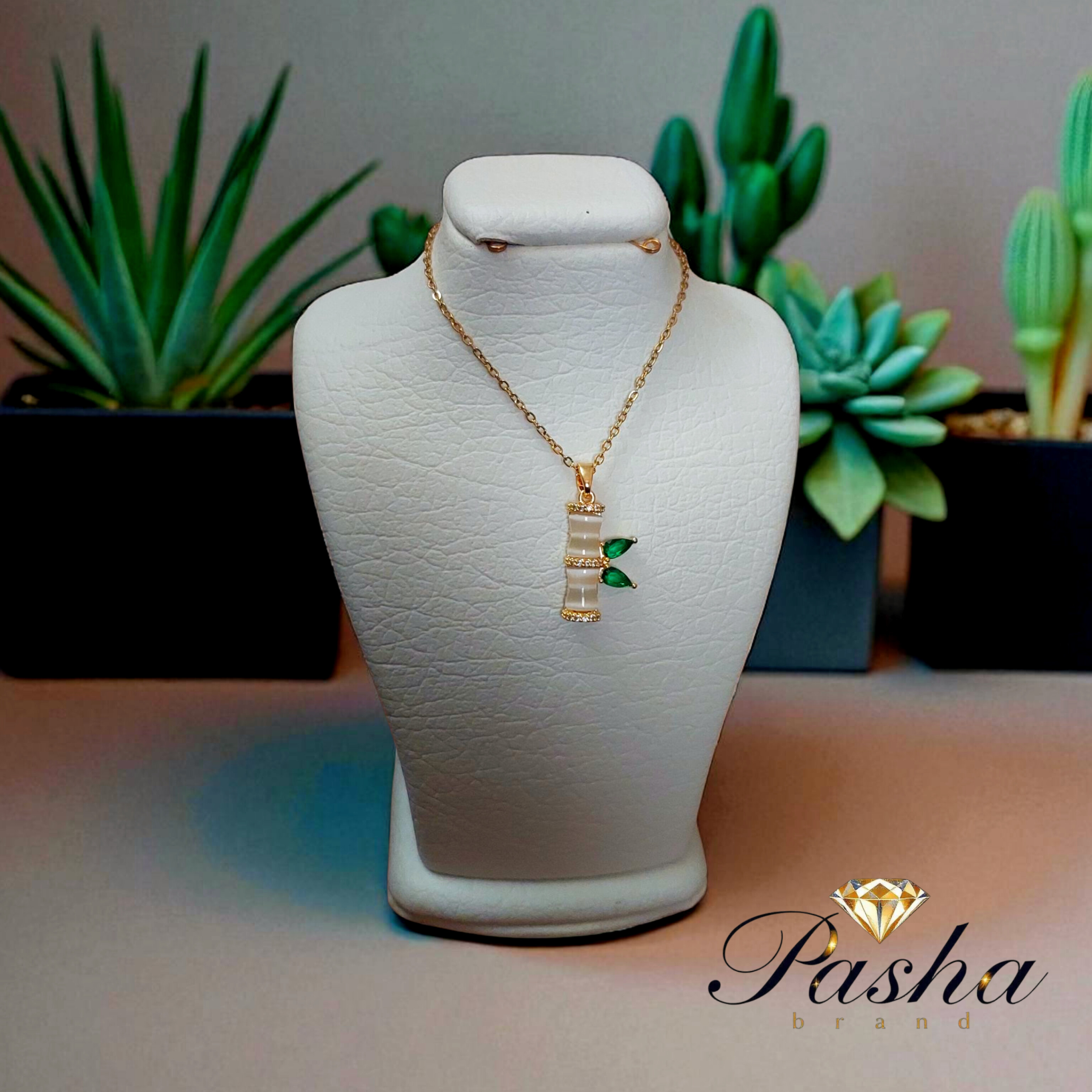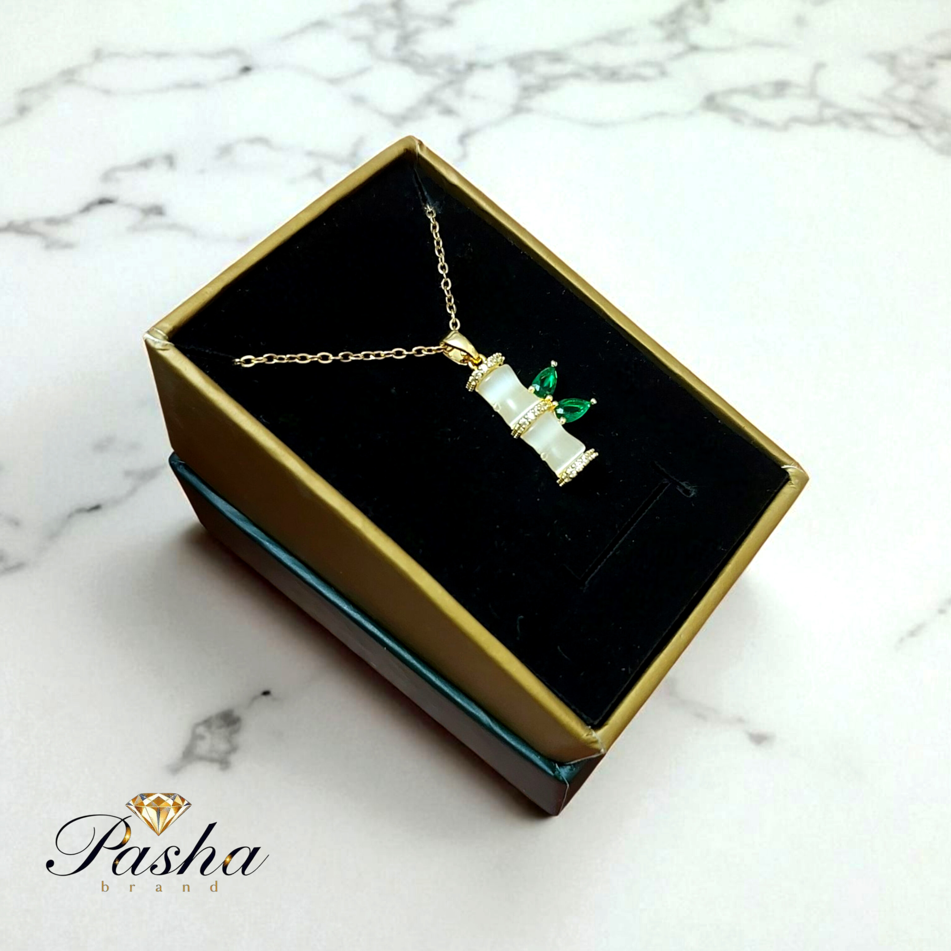 گردنبند زنانه طرح ساقه بامبو با برگ سبز نگینکاری شده